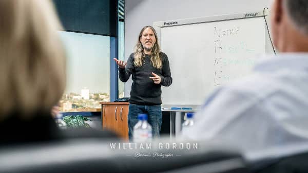 I even give presentations from memory sometimes based entirely on simple acronyms. For example, I sometimes write “NAME” on a chalkboard when teaching people how to remember names using the strategy we’ll discuss next. If you look at the image of me above from one of my live memory training sessions, you can see NAME on the whiteboard behind me.
