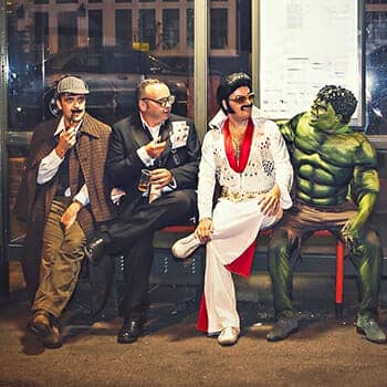 It features people sitting at a bus stop dressed like the Incredible Hulk, Elvis, probably James Bond and Sherlock Holmes.