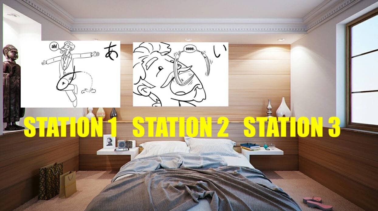 It was a simple matter to place weird and interesting mnemonic images on stations in my Mind Palace. Like you see illustrated in this Mind Palace example with the first two hiragana characters elaborated on two stations in a bedroom: